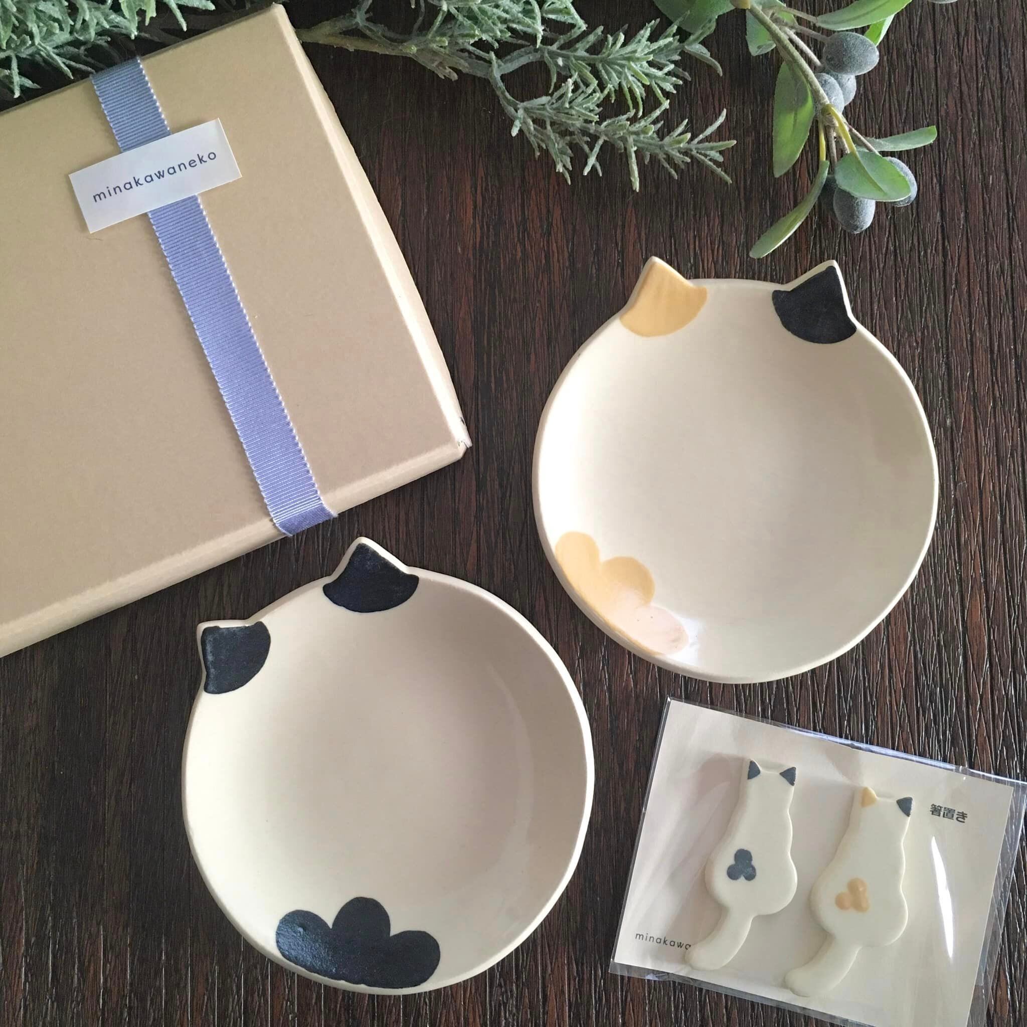 小皿1枚と箸置き1個を、三毛猫・ハチワレ猫・白猫から選べるセットです。