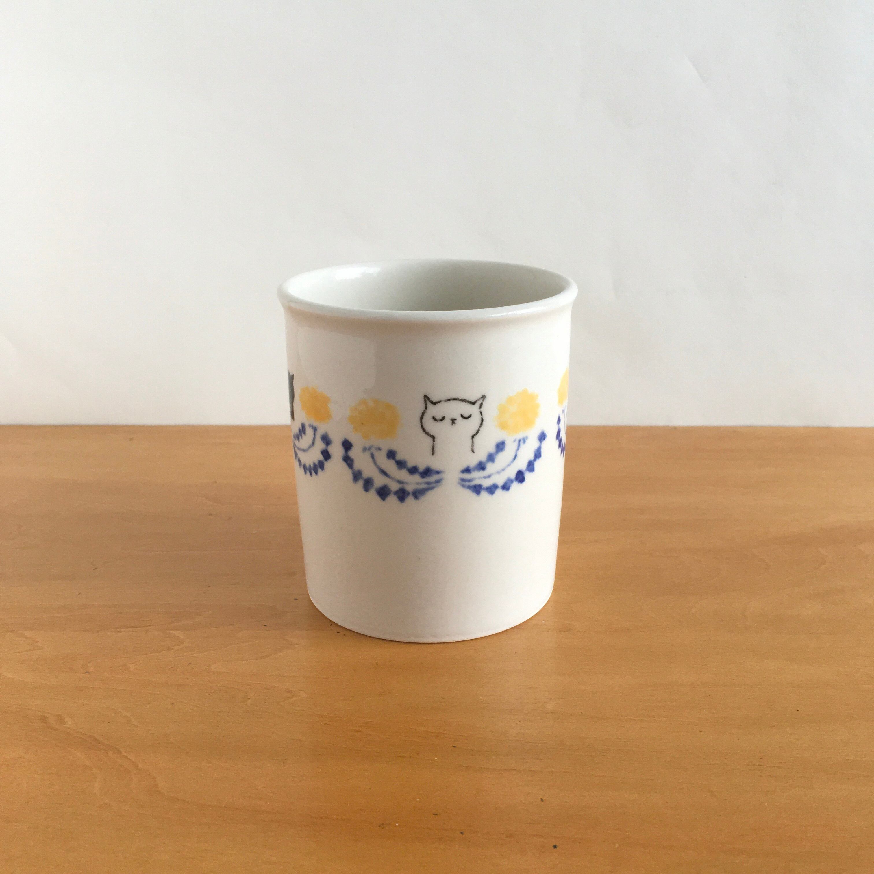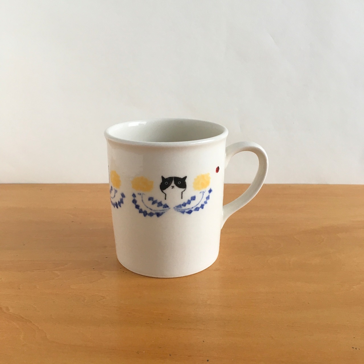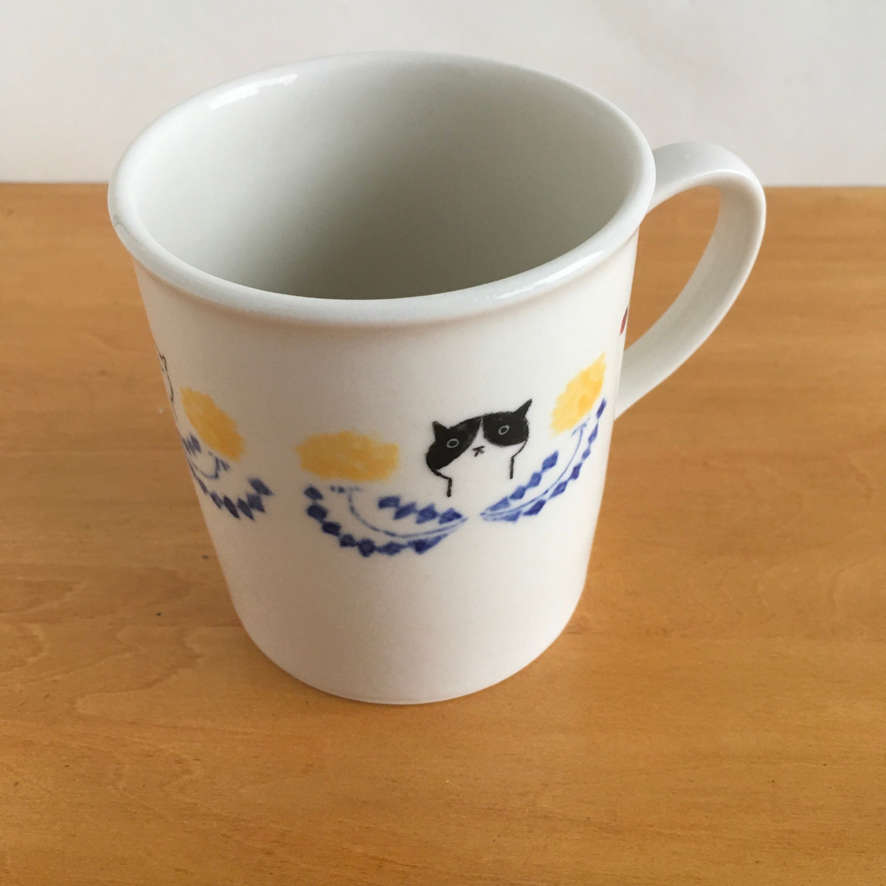 そのそばでくつろぐ猫たちを描いたマグカップです。