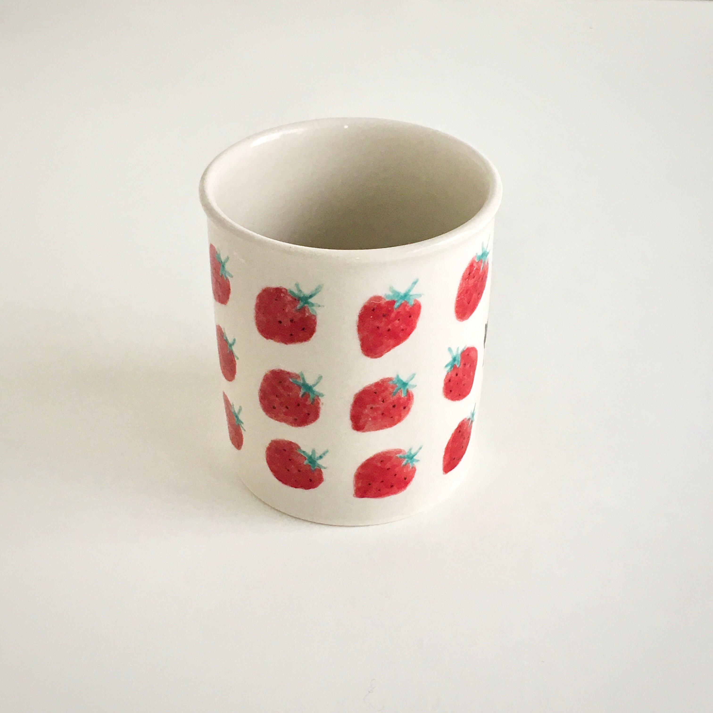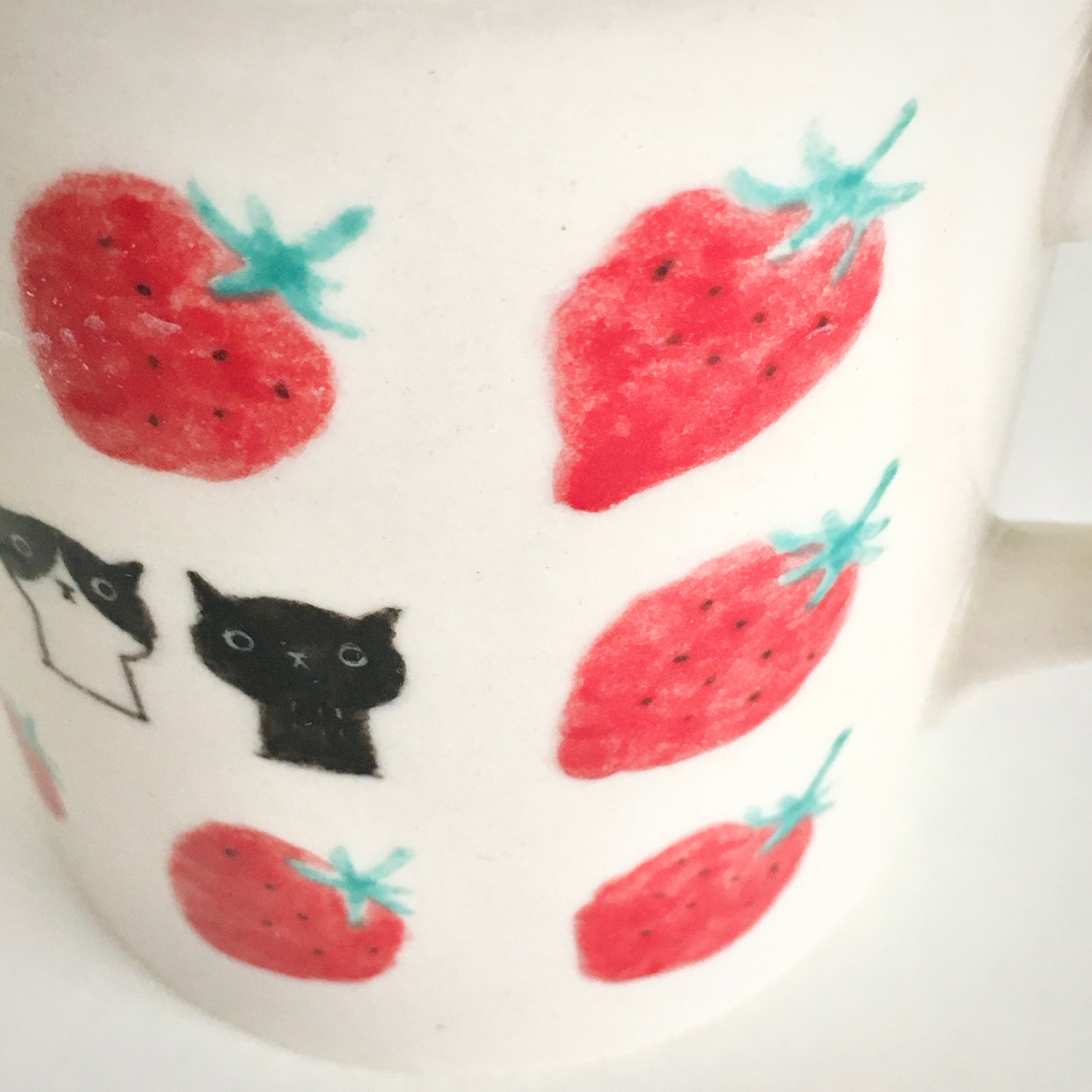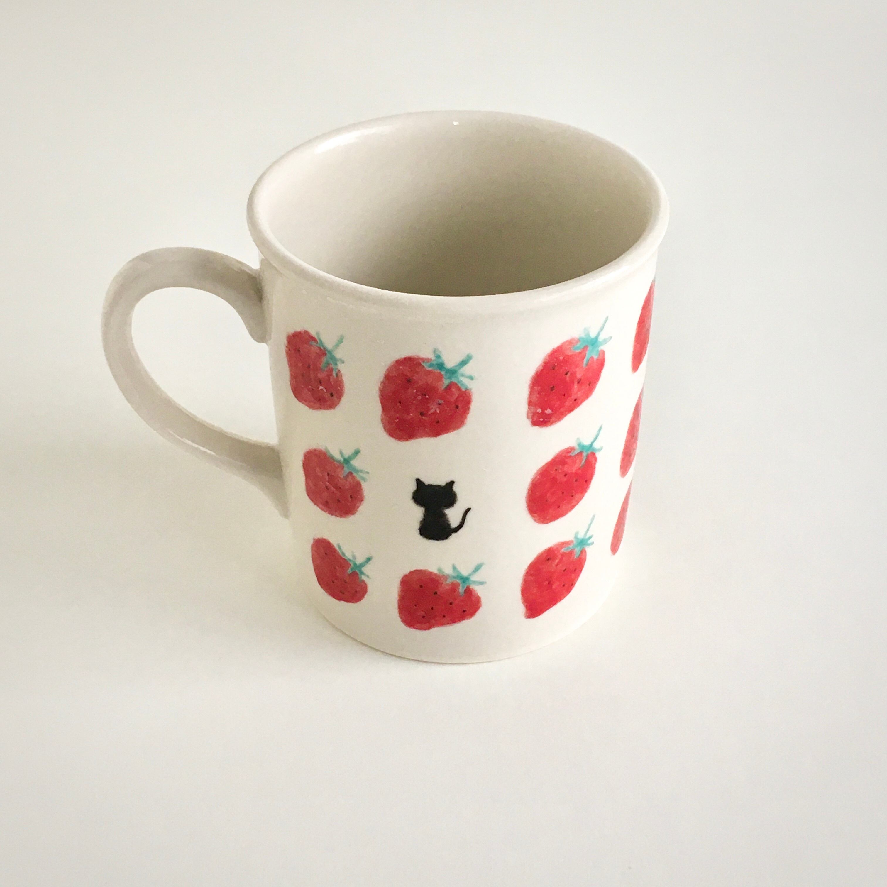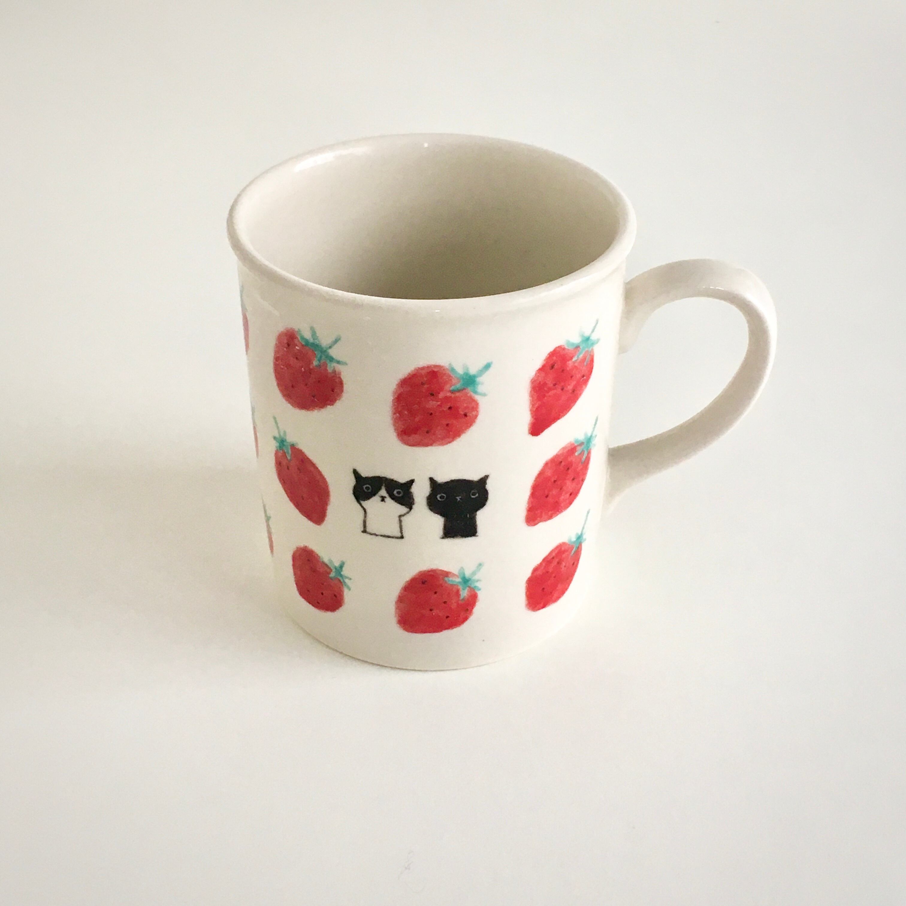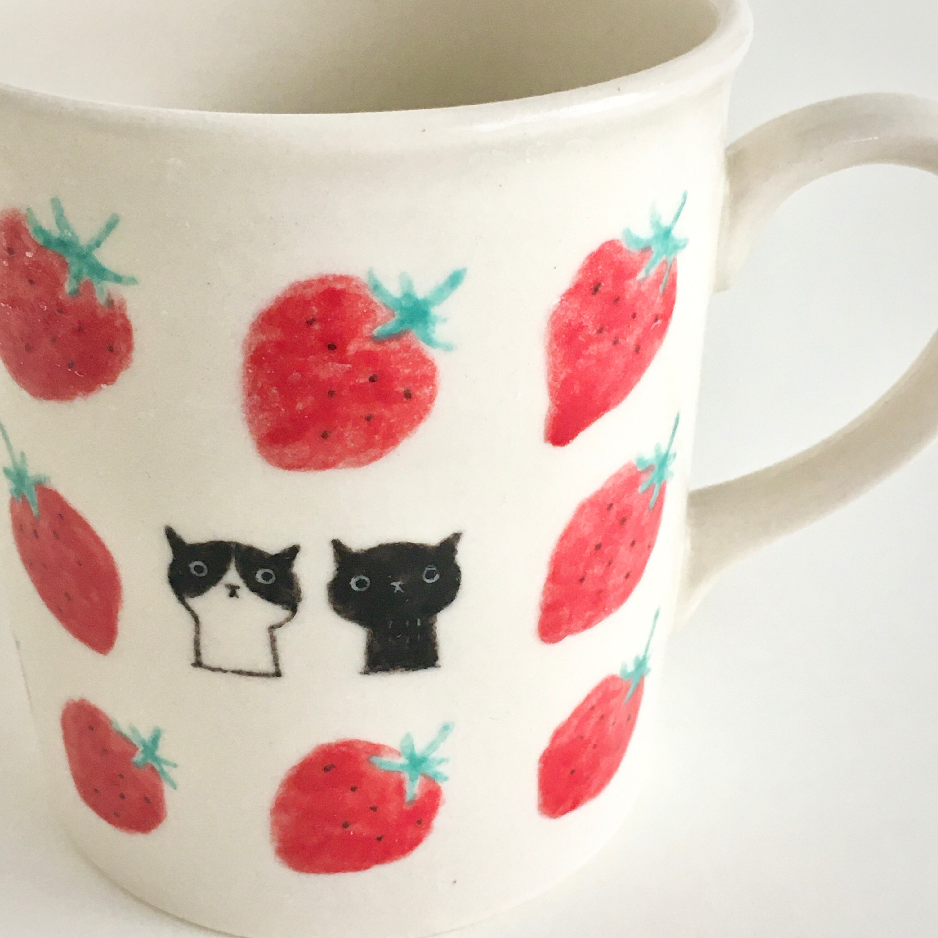 苺の明るさに元気をもらい、猫にほっとするマグカップです。